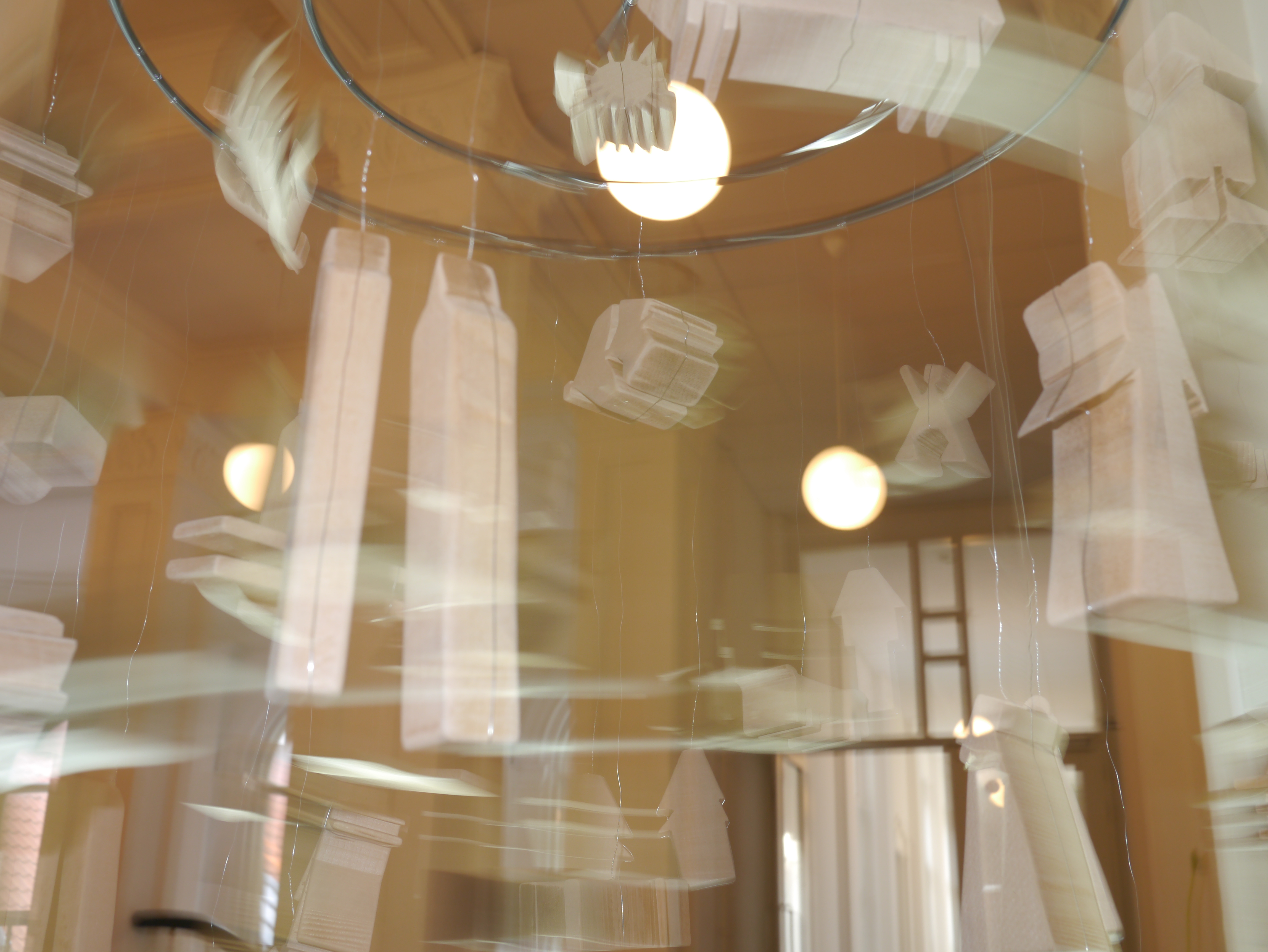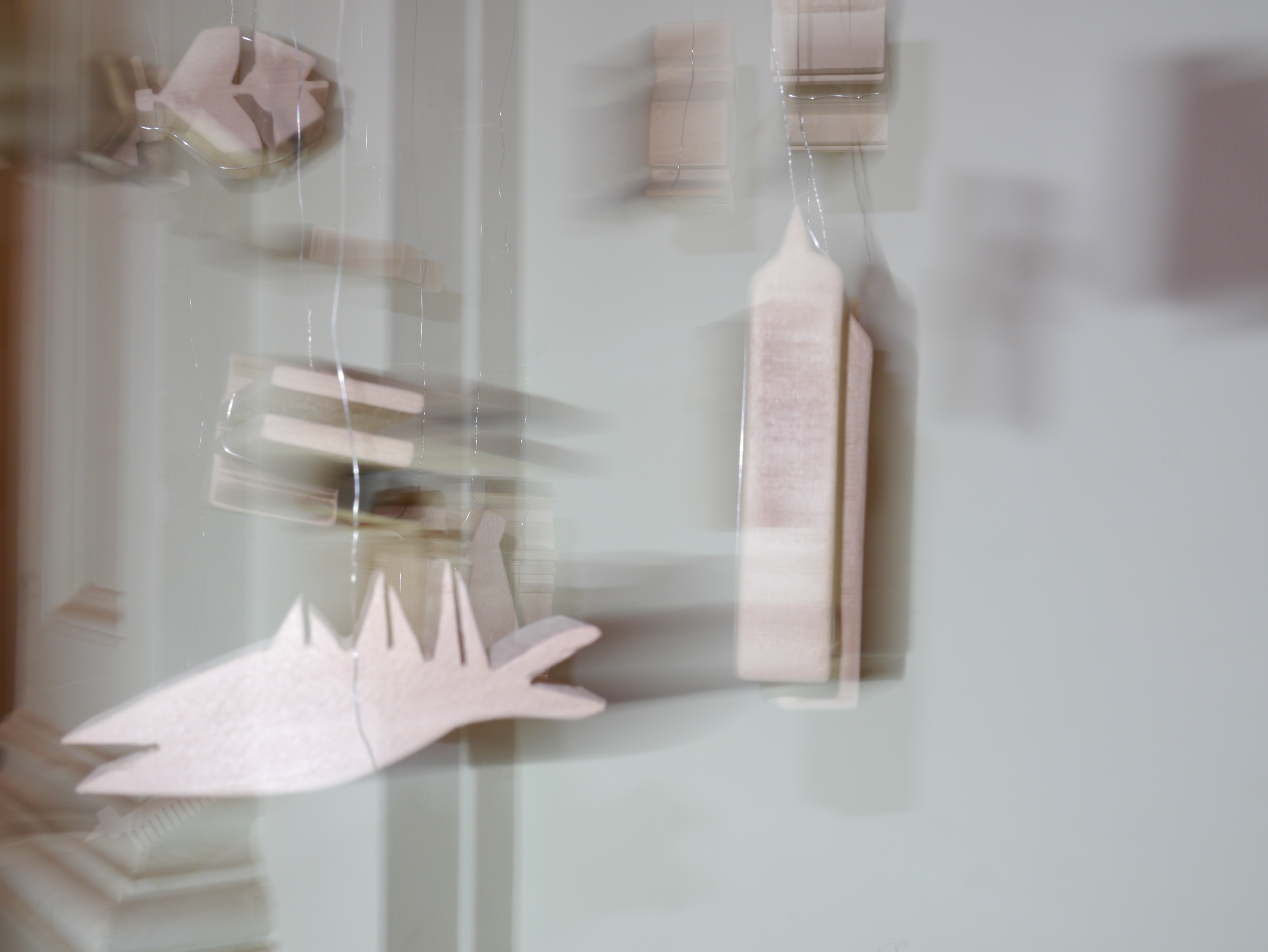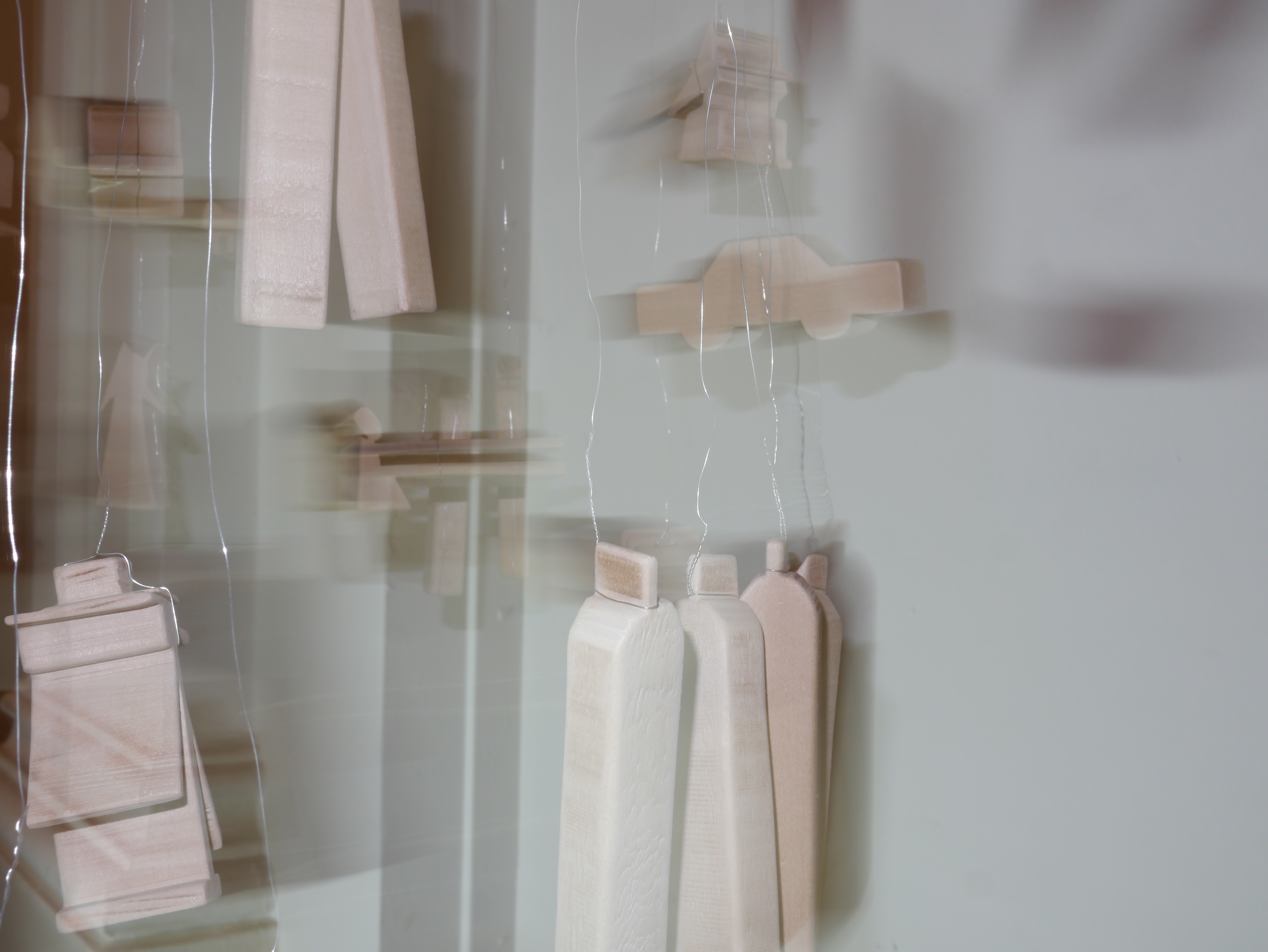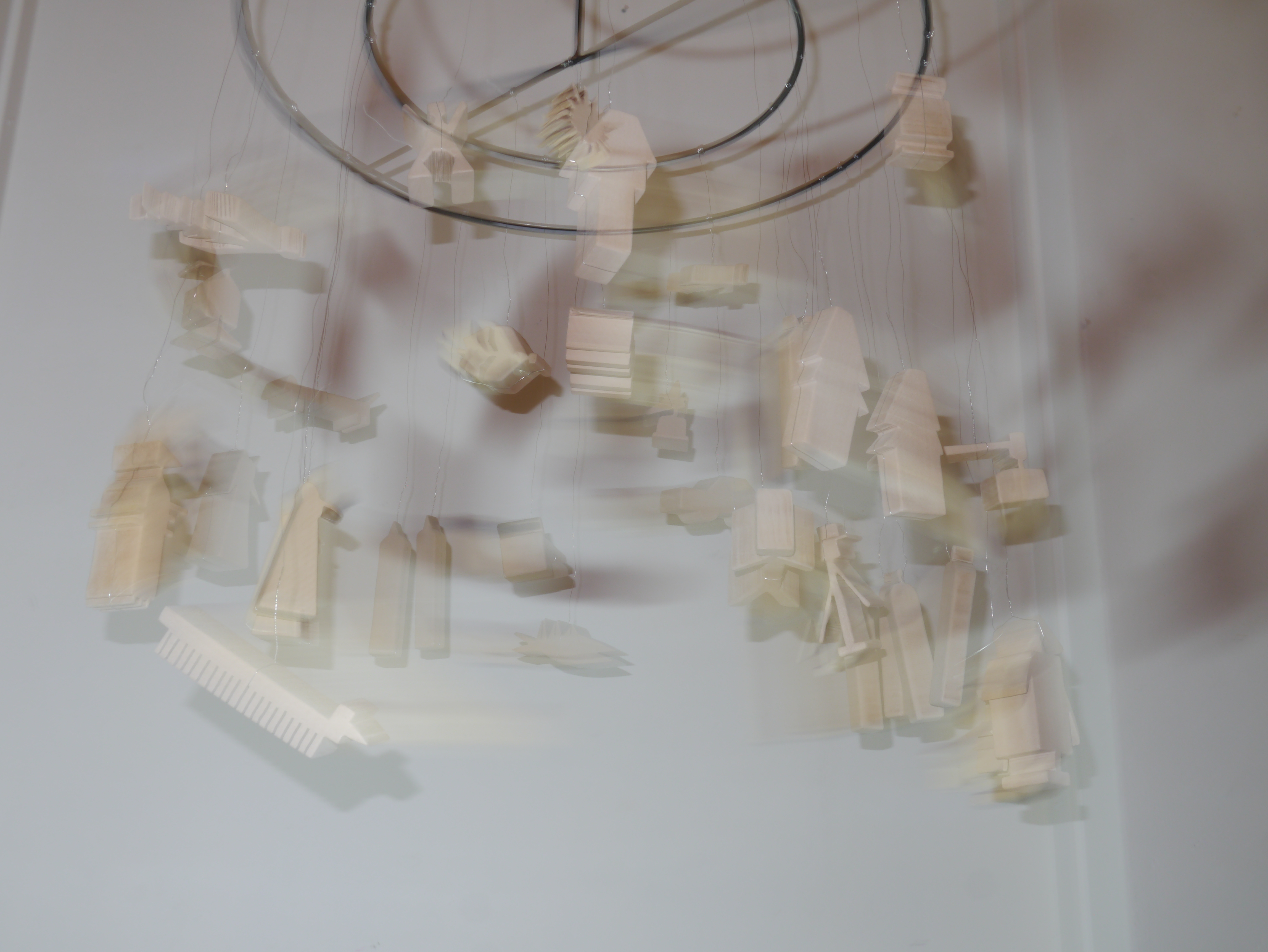-hand chiseled wood, metal, electric drill spinning mechanism, soundscape